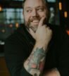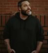 A person wearing a jacket with the Google logo is looking out of a large window at a scenic cityscape featuring a mix of modern and traditional architecture.